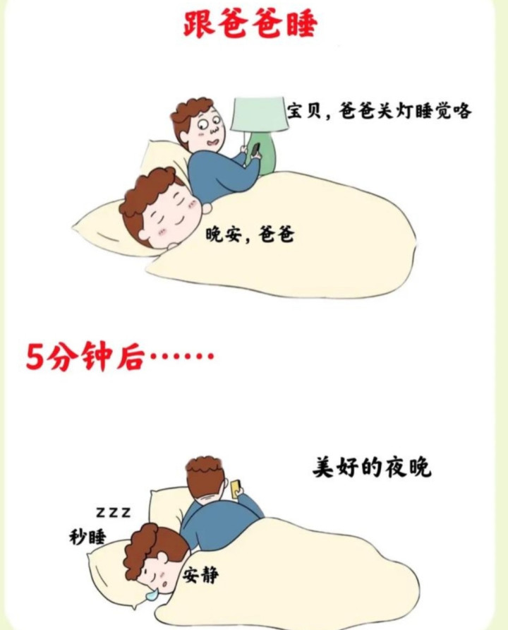 孩子和爸爸睡的时候,爸爸是真睡,他比孩子睡着的都早,孩子自己玩着玩着,觉得没意思,也就睡着了。